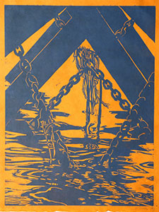 “Peer Under Pier III Blue Orange” by Charles Norris merges representation with abstraction. The blue print on an orange background depicts chains hanging into the water alongside the crossbeams of a pier. While the scene is realistic, the piece emphasizes the shapes and lines more than the objects themselves. The print also incorporates several other dichotomies including a complementary color scheme, the merging of land and water, and the contrast between solid and fluid subjects.